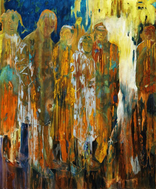 Lorian Gwynn (2001) behaalde haar bachelor in 2023 aan de Hogeschool voor de Kunsten in Utrecht en rondde in 2025 haar artist in residency in De Ateliers af. In 2023 was ze genomineerd voor de Koninklijke Prijs met werken waarin ze herinneringen aan haar kindertijd en aan haar reis naar Indonesië tot uitdrukking bracht. Opnieuw neemt zij onderwerpen die dichtbij staan als uitgangspunt, dit keer in portretten en groepsportretten van mensen uit haar directe omgeving, zoals in het werk getiteld ‘Jessica’ (2025). Anders dan de bijna transparante verf in dit portret is in de groepsportretten sprake van stapeling van verflagen. Het lijkt alsof sommige delen in de compositie zijn verdund en vloeibaar zijn geworden, terwijl andere delen zijn opgedikt met extra verf, modelleerpasta en zand. Gwynn experimenteert met het genre van het klassieke groepsportret, maar zonder een hiërarchie aan te brengen in de afgebeelde personen. Het gaat haar evenmin om de representatie an sich, ze wil ruimte geven aan intimiteit en het ongrijpbare dat zich tussen vrienden afspeelt. Het gaat haar om de verbondenheid die zij ervaart met haar vriendenkring, haar ‘community’. Deze benadering van het groepsportret hangt nauw samen met de intense beleving van het kunstenaarschap dat haar op dit moment de vrijheid biedt om te mogen blijven zoeken en zich te ontwikkelen. Het grote, kleurrijke ‘A Celebration of Unfinished Thoughts’ (2025) beschouwt Gwynn als “een ode aan gedeelde ruimte, vrijheid, en het oneindige proces van maken”. Het is een momentopname van een gezellig samenzijn met vrouwelijke collega-kunstenaars na een diner. We zien de onderlinge verbondenheid terug in de houding en uitdrukkingen van de personages. Voor een hek staan vier figuren ontspannen met elkaar in gesprek, terwijl de zittende figuur op de voorgrond oogcontact zoekt met de toeschouwer. Het werk viert hoe ideeën voortdurend in beweging zijn en steeds weer nieuwe vormen aannemen, aldus Gwynn. In het groepsportret ‘Poker night’ (2025) maakt Gwynn gebruik van dezelfde gelaagde schildertechniek. Het verbeeldt opnieuw een groep mensen uit haar directe omgeving, waarin ze haar herinneringen aan het samenzijn met hen, de gesprekken, en de stille momenten samenbrengt in een momentopname. Of zoals Gwynn het noemt, een “veelstemmige herinnering, die steeds in beweging is”.